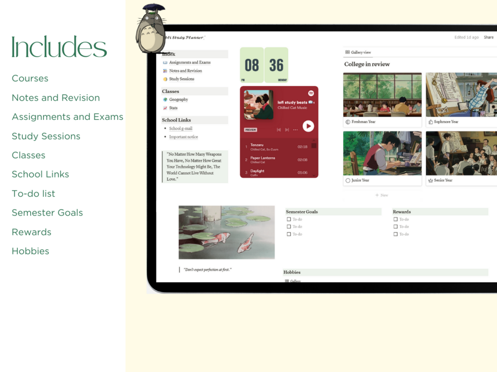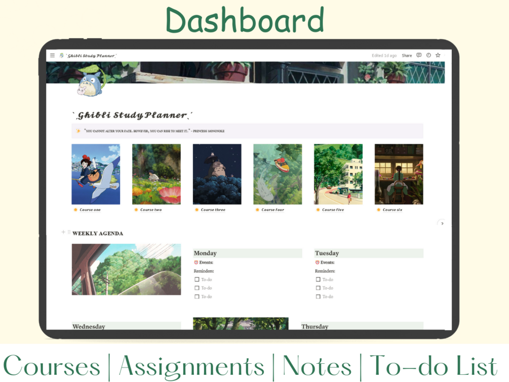 Discover the Ultimate Studio Ghibli-Themed Notion Student Template. Effortlessly manage courses, assignments, exams and more with our meticulously crafted Studio Ghibli-inspired Notion template. Stay organized, boost productivity, and immerse yourself in the captivating world of Studio Ghibli while achieving your academic goals. Elevate your student journey with this enchanting template today!